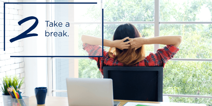 Finding yourself sitting in the same spot staring at the computer all day — minus a few bathroom breaks and kitchen runs — is a surefire way to zap the energy right out of you, along with major eye strain. Schedule breaks: get up and stretch or follow the 20/20/20 rule, which means that every 20 minutes you look at something 20 feet away for 20 seconds. It could be as simple as looking at office greenery or staring out the window.