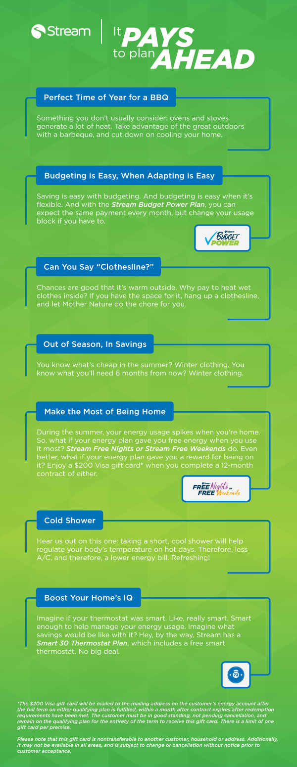 Summertime is almost here, meaning it’s almost time to say hello to the usual staples: hello popsicles, hello pool days, hello sun tans, hello sun burns. And, hello air conditioning. With that, don’t let summer bring bummer in the form of high energy bills; Stream has plenty of ways to help you save.